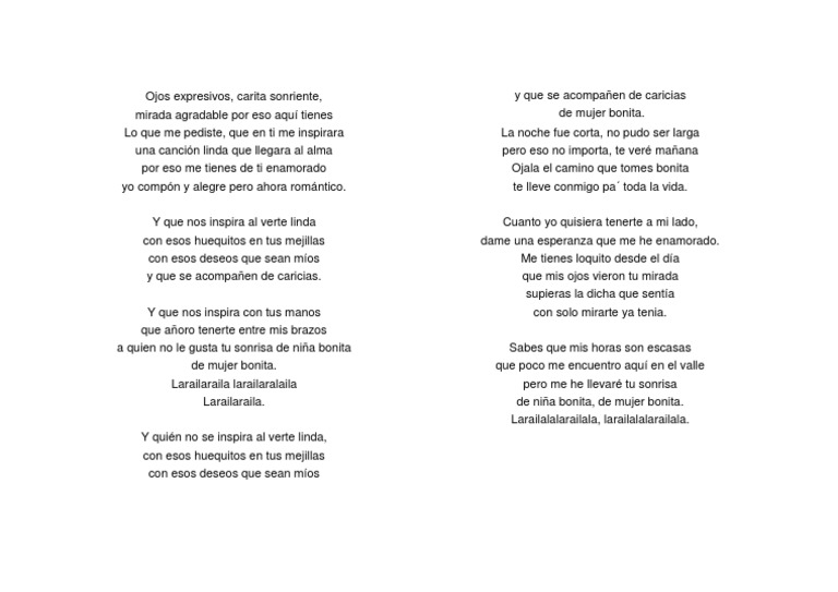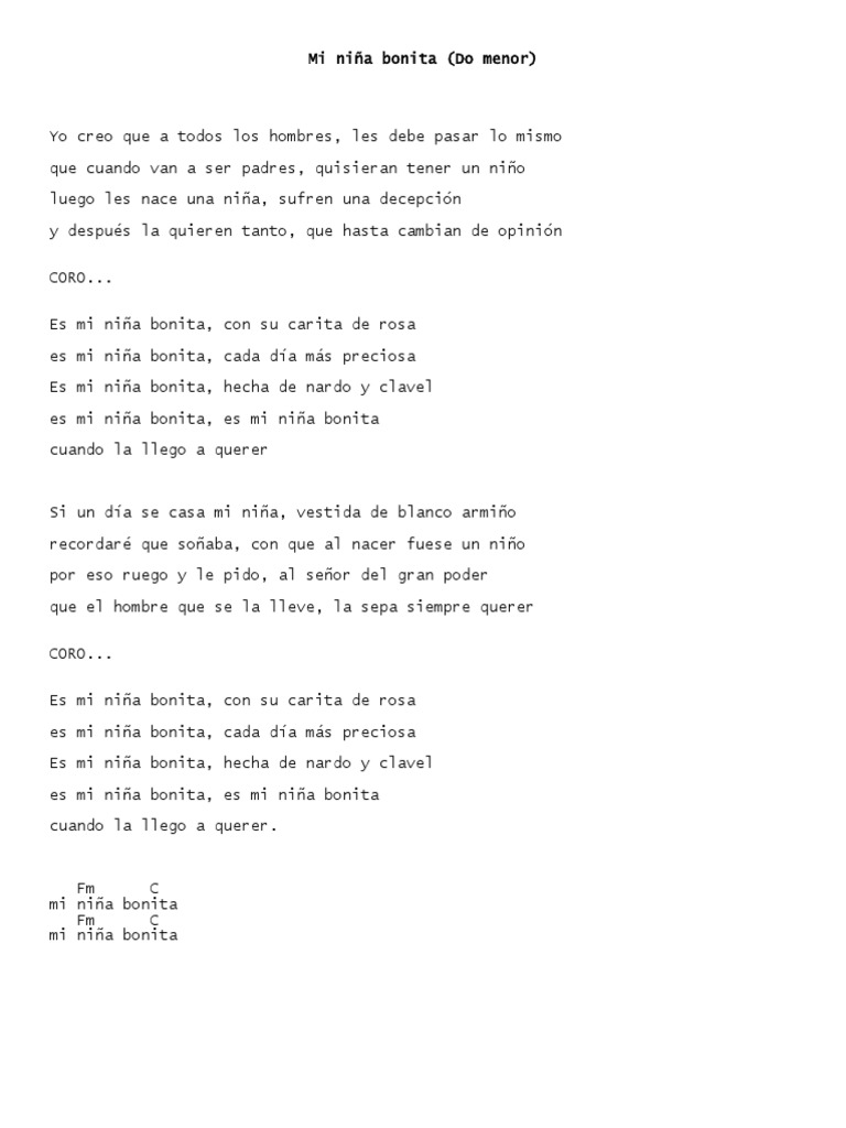 Sabes que mis horas son escasas Que poco me encuentro aquí en el valle Pero me llevaré tu sonrisa de niña bonita De mujer bonita. Me siento en las nubes cuando tú me besas. Es mi niña bonitahecha de nardo y claveles mi niña bonitaes mi niña bonitacu.